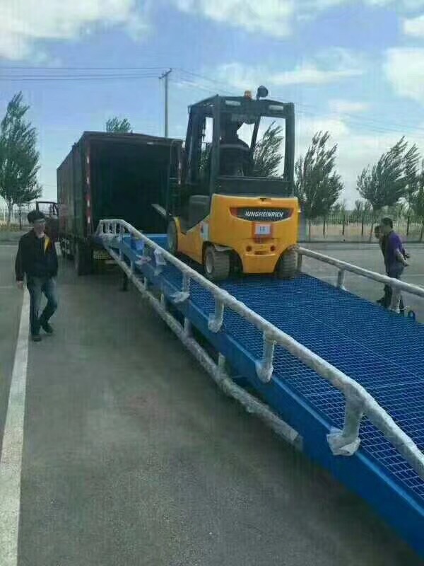 2、產品用途:移動式登車橋廣泛用于無裝卸設備的貨臺及流動裝卸場所,是與叉車配合使用的貨物裝卸輔助設備。借助該登車橋設備,叉車能直接駛入汽車車廂內部進行批量裝卸作業。只需單人操作,不需動力電源,即可實現貨物的安全快速裝卸。既可使您減輕勞動強度,又能成倍提高裝卸作業效率,加快物流流通速度,獲得更大經濟效益。