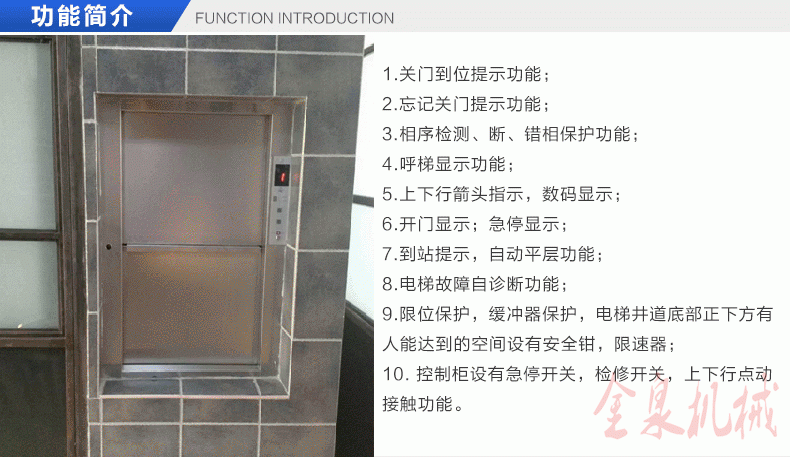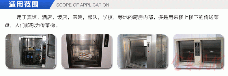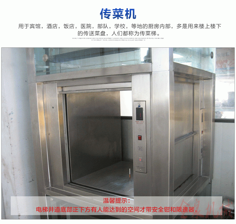傳菜升降機是指用于賓館、廚房、食堂、飯店、 幼兒園、商廈、工廠等部門,用于傳送食品、餐具、日用品的電梯。