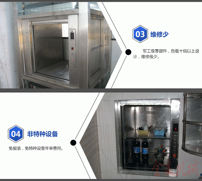 此形式的傳菜電梯在距地面的一定高度平層,形成工作平臺,與操作人員腰部水平,適合使用者運送體積小,重量輕的物品,形式靈活多樣,可在多種場合下使用.