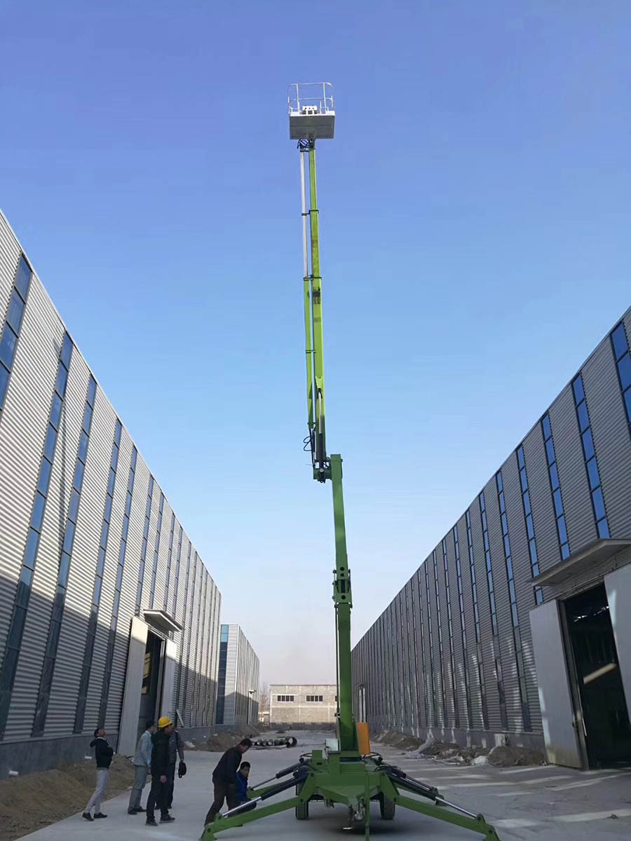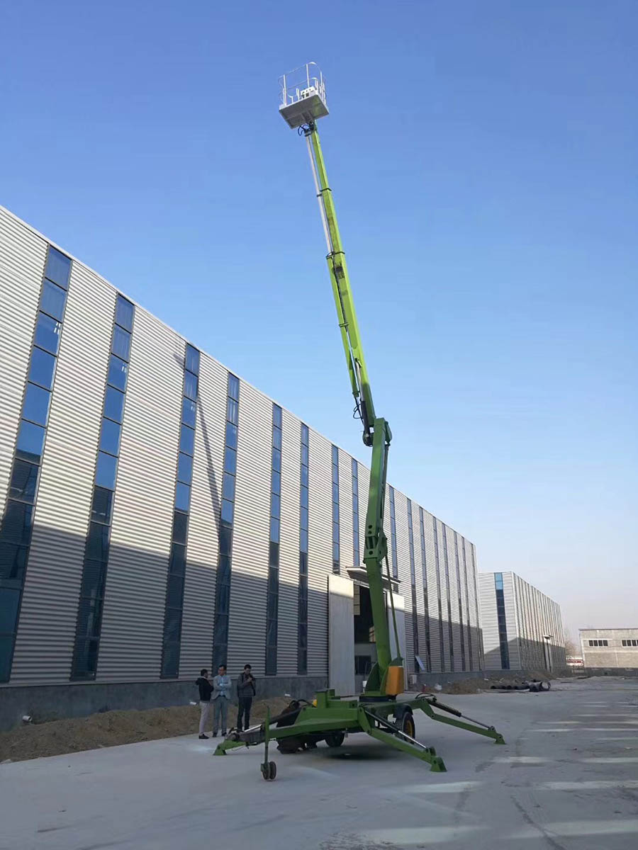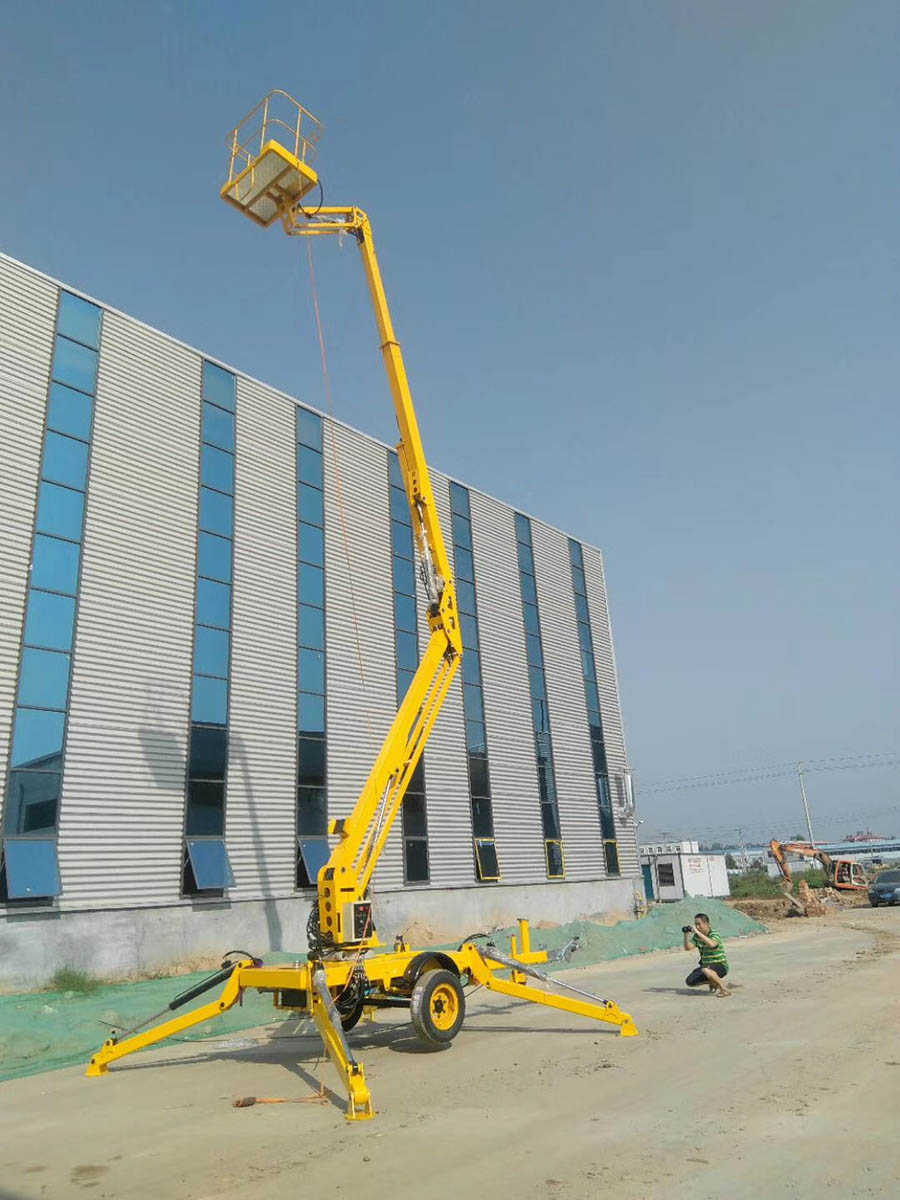 拖車折臂式升降機升高時候是曲折狀態的,升降平臺的結構采用了機電液一體化、可靠性設計和計算機輔助設計等技術,是一種全液壓驅動、自行式專用底盤。