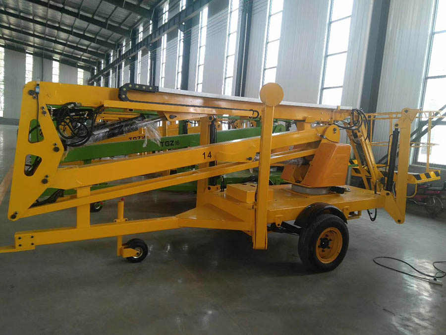 拖車折臂高空作業平臺車升高時候是曲折狀態的,升降平臺的結構采用了機電液一體化、可靠性設計和計算機輔助設計等技術,是一種全液壓驅動、自行式專用底盤。