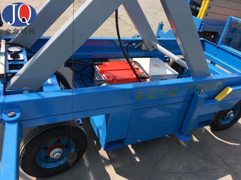 7、四輪移動式升降平臺也可配上手動液壓裝置,可在停電或無電源場所照常升降工作,并可加伸縮平臺,在平臺長度不足時可延伸至所需位置,從而提高工作效率。
