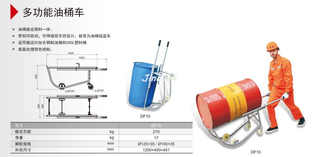1.油桶搬運倒料一體 2.帶鉤可轉動,可伸縮雙手把設計,被譽為油桶搖籃車 3.適用搬運55加侖鋼制油桶和200L塑料桶 4.表面處理銀色噴粉