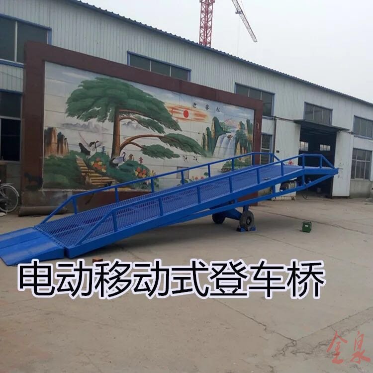 電動移動式登車橋的主要作用是,在地平面與車廂之間搭起一座橋,有了它,叉車能直接從地面攜帶貨物駛入汽車車廂內部,進行批量裝卸作業。使用時,前板架在貨車車廂上,起到承載重量的作用,減少了貨物重量對液壓登車橋的壓力,保證了液壓登車橋的使用壽命,從而達到長期使用的目的。