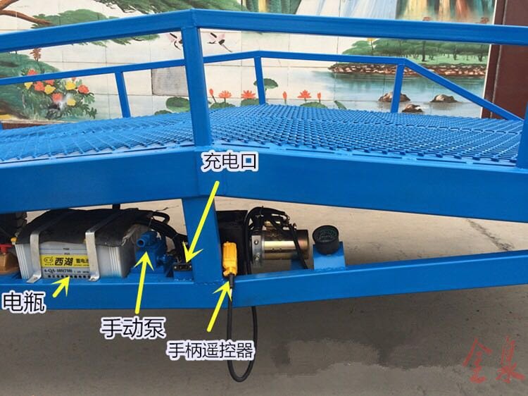 1、電控操作只需按動按鈕,調節板會自動升起,操作極其簡單;松開按鈕,調節板靠自重下降, 活頁搭板搭在貨車上即可使用。